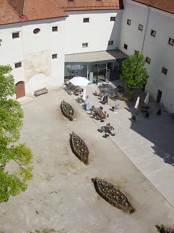 Okrem stalej expozicie s divadlom, multimedialnou prezentaciou a hravou mapou su v zamku este prilezitostne vystavy. Nachadzaju sa na podlaziach juhozapadnej, "bocianej" veze. Pocas sezony v roku 2009 tam boli dve vystavy - fotovystava o Vojvodine a jej podunajskej krajine a zvukova vystava nazvana Zvukova mapa Dunaja. Jej autorka, Novozelandanka Annea Lockwood zaznamenavala od maja 2002 do leta 2004 zvuky rieky a vypovede ludi od pramena Dunaja v nemeckom Schwarzwalde az po dunajske ustie. Vo vezi si lahnete na pruhovane plazove lezadlo, zavriete oci a pocuvate. Na najvyssom, navstevnikom pristupnom podlazi, sa mozete pozerat na zivy prenos z bocianieho hniezda, ktore je o poschodie vyssie - na samej vezi.