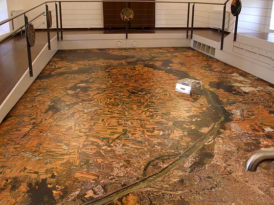 V dalsej miestnosti bezi video, v ktorom sa okrem ineho dozviete, ze narodny park vznikol po protestoch ochrancov prirody proti planom vybudovat pri Hainburgu vodnu elektraren, a do tretice - v tretej komnate - vas caka nieco, co na prvy pohlad pripomina prazdny bazen. Ibaze nema obycajne dno - ale dno s mapou. Je to letecka mapa celeho uzemia narodneho parku - od predmestia Viedne az po Bratislavu v podrobnej mierke 1:8900. Do mapoveho "bazena" sa da vstupit - ale iba v pripravenych plstenych papuciach. Zo stien "bazena" nas sprievodca vytahuje zasuvky, v ktorych su velke lupy. Vdaka nim sa daju priblizit zakutia dunajskych ramien, ale ako hovori sprievodca, niektori navstevnici si vraj na mape nasli aj zahradku svojho domu. S mapou sa da vselico vymysliet - napriklad aj hru so skladackou - jednotlive kusky mapoveho puzzle visia na zabradli okolo "bazena", alebo preteky s hracou kockou - kto prvy obehne narodny park.