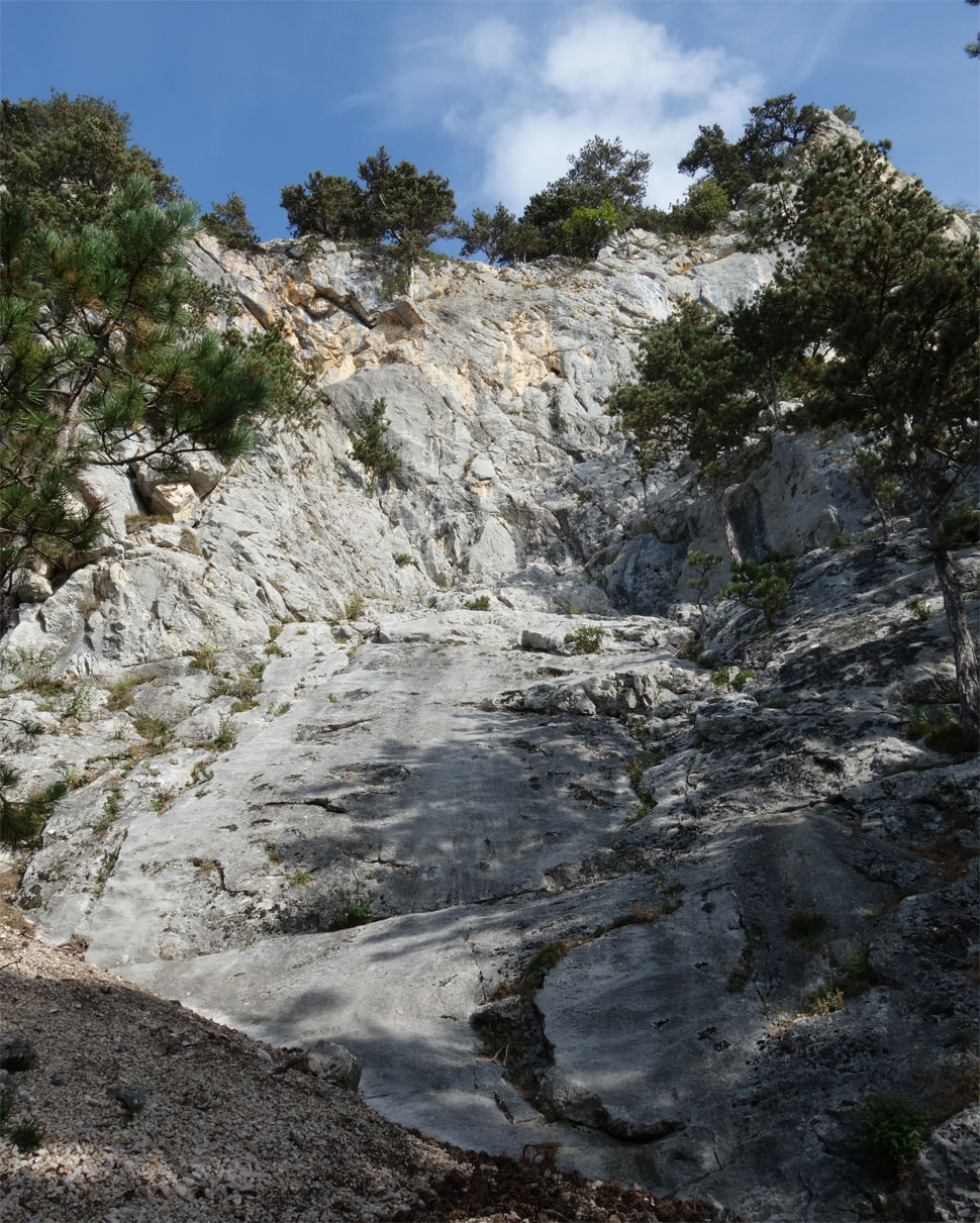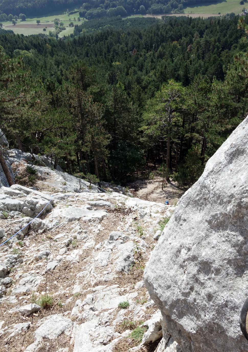 Po doleze štvrtej dĺžky je prekvapivo dlhý chodecký úsek svahom medzi stromami. Topo naznačuje, že treba ísť šikmo doľava, ale ako niekto na Bergsteigen.com uviedol, treba ísť skôr priamo hore a nájdete tam na skalnej stienke ďalší zelený krížik, ktorý označuje štart druhej časti Zentennia.