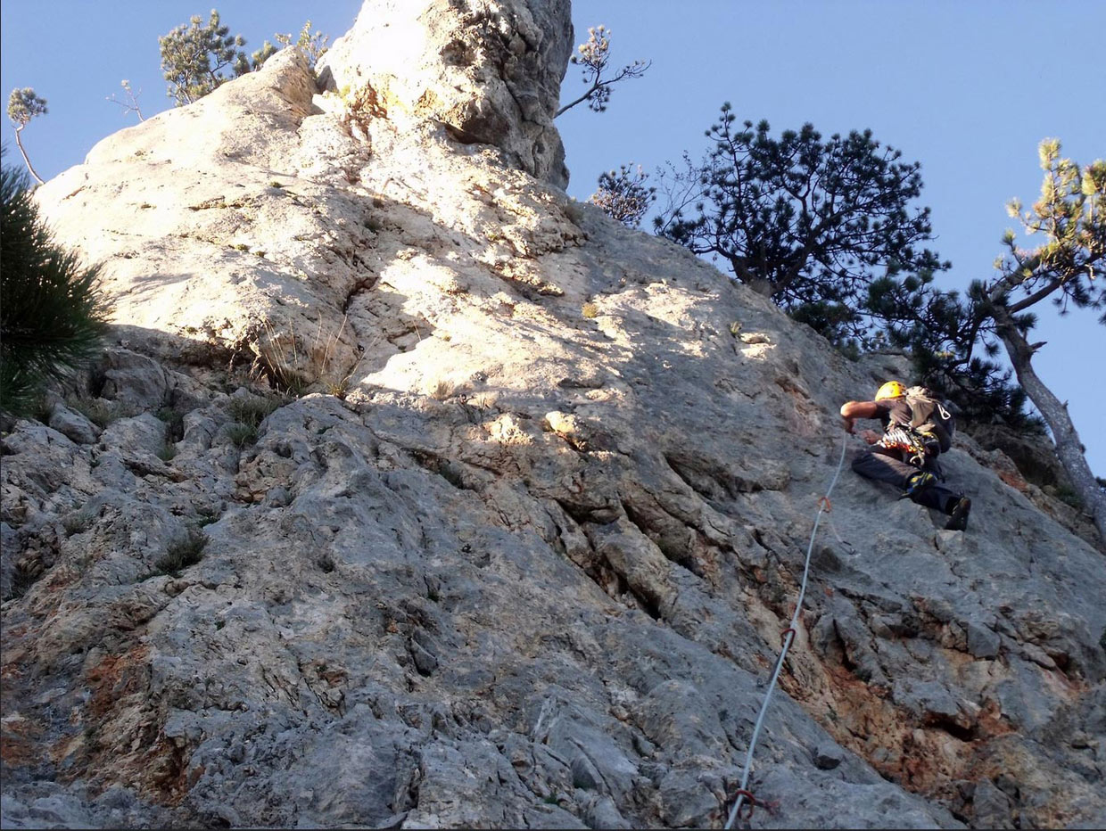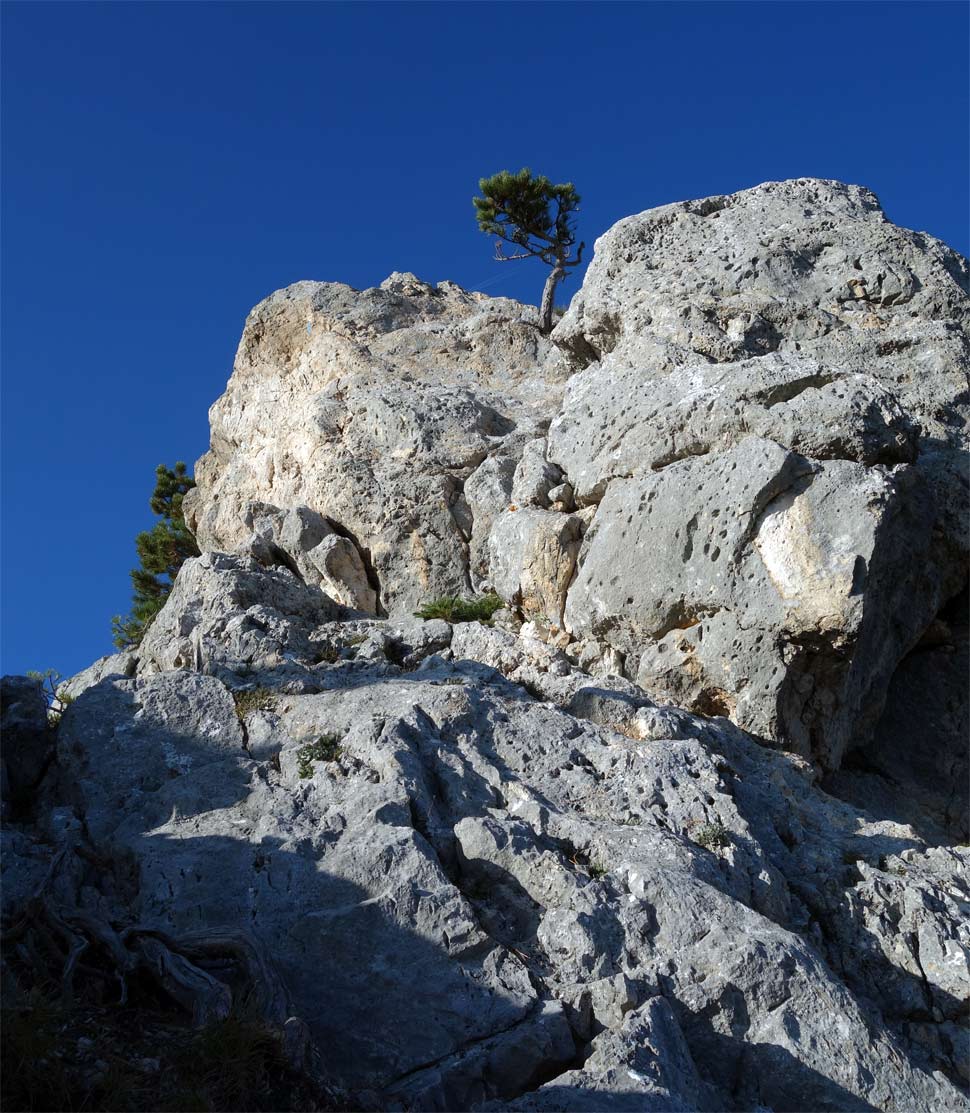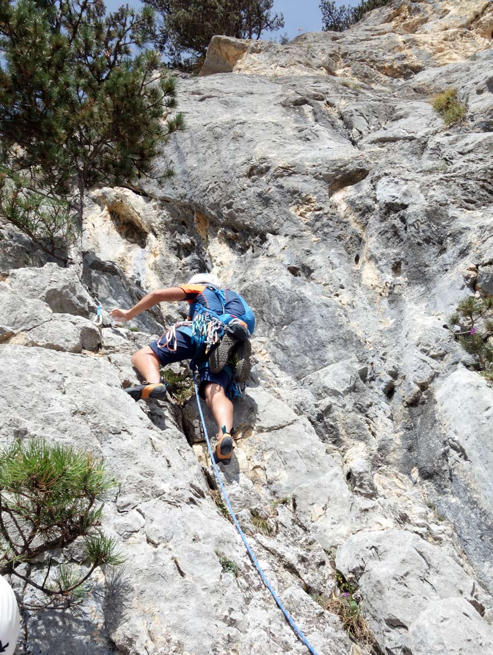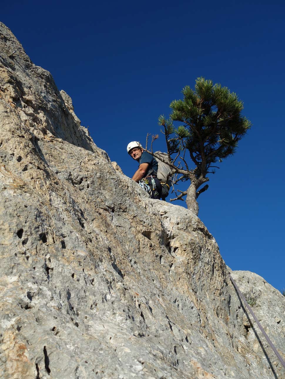 Prvá dĺžka v druhej časti cesty po chodeckom úseku je 20-metrová trojka. Potom je šiesta kľúčová dĺžka ohodnotená v tope ako 6-. V tope je pri nej napísané "schön", čo obvykle znamená, že si zalezieme a nebude to zadarmo. Tu som sa musel rozlúčiť s onsajtom, pretože v platni niekde nad štvrtým borhákom som zavrávoral. Potom som navyše zbrklo odbočil do ľahších chytov vpravo a skončil som tak, že som si zapínal lano do slučiek na borovici. Odlez od istenia sa mi zbytočne predĺžil, ale najhoršie bolo, že lano začalo príšerne drhnúť a len s námahou som sa potom preplazil cez zaujímavý výšvih na vežičku. Najviac som ľutoval, že tú istú tortúru bude za mnou musieť postúpiť Boris, keď bude vypínať istenie na konári. Boris mi potom povedal, že on si nad miesto, kde som odbočil, trocha nadliezol a zdalo sa mu to tam byť už ľahké, takže moja odbočka doprava bola úplne zbytočná...