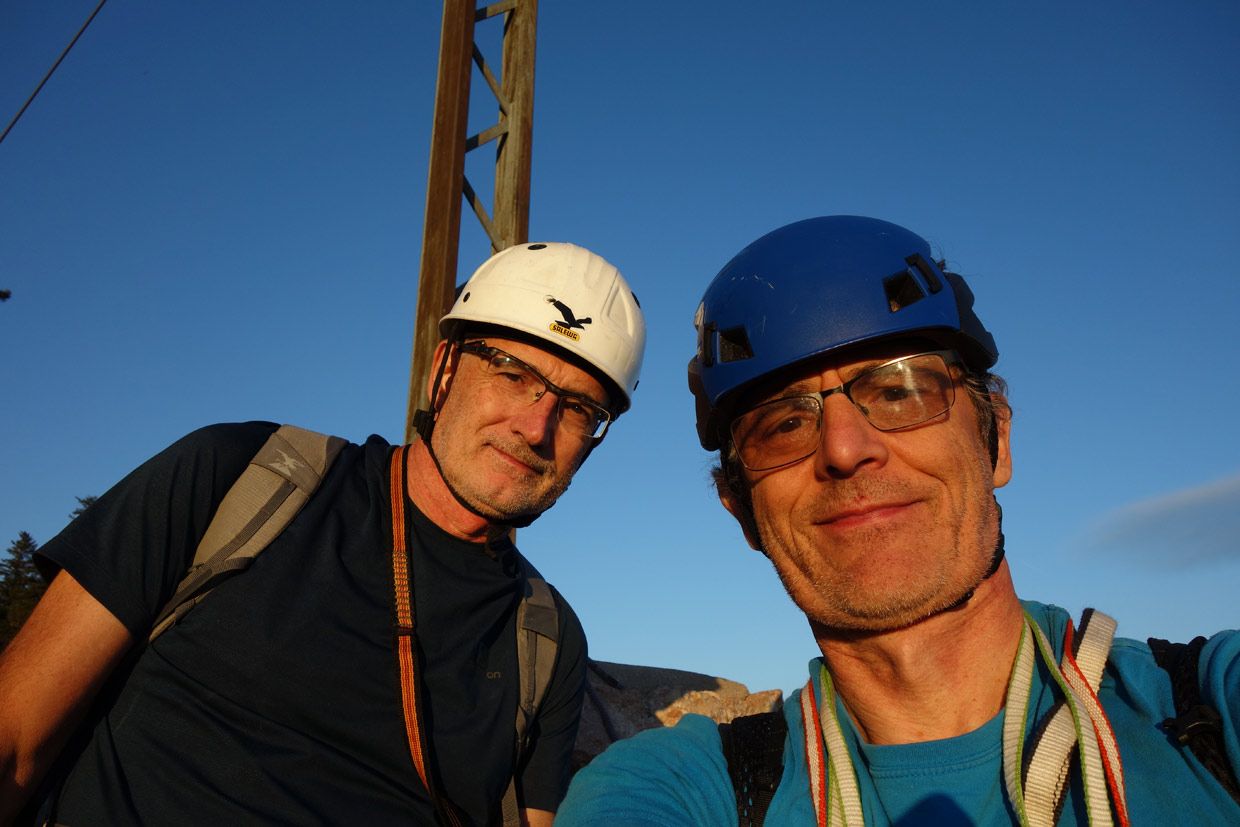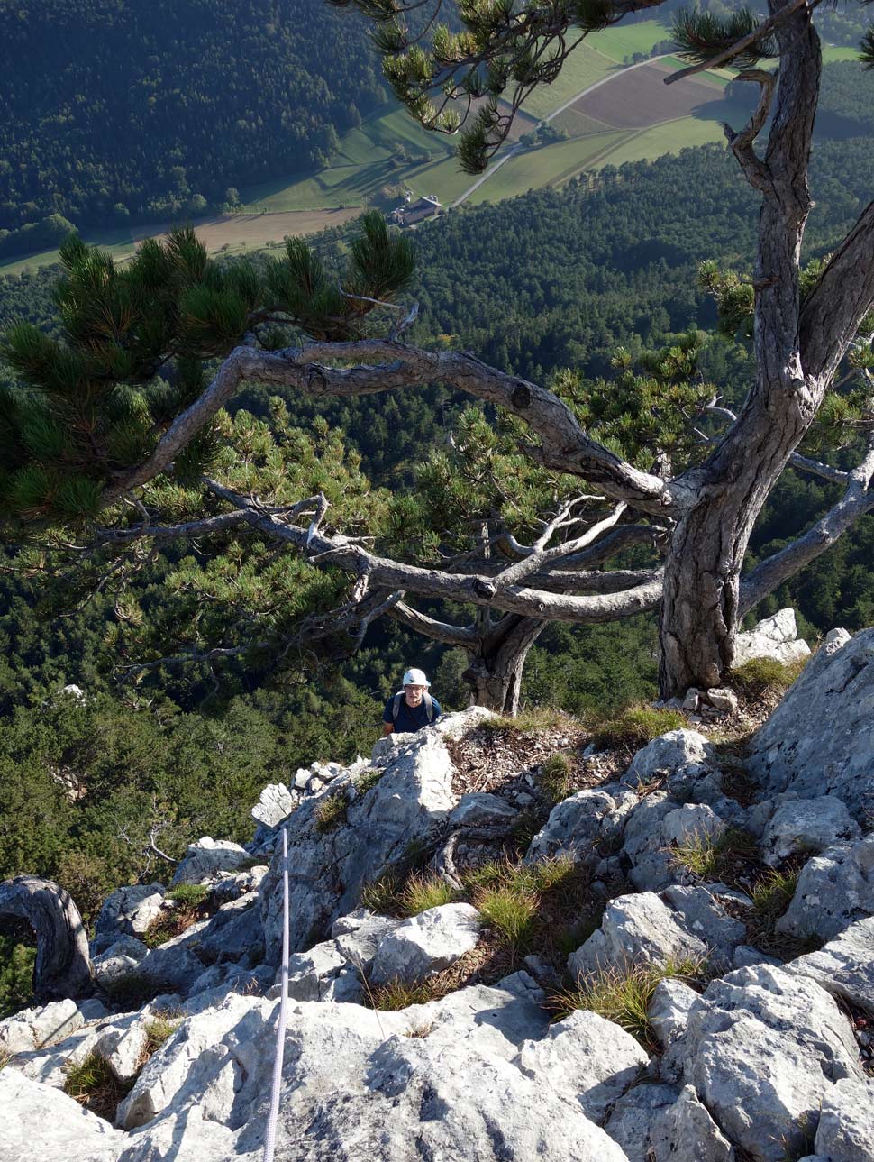 Od knihy nasledovala 7. dĺžka s celkom pekným výlezom po pilieri na vežičky. Potom sme si mysleli, že sme už hore, pretože sa nám zdal byť na dosah veľký vrcholový kríž na Veľkej kazateľnici (Grossen Kanzel je hohewandský vrcholček s nadmorskou výškou 1042m) ale cesta nekonečne pokračovala po hrebeni a ďalších vežičkách. Miestami sme ich išli voľne, miestami sme sa istili. Ako niekto napísal do diskusie na Bergsteigen.com, keby bolo vlhko, tak by to mohlo byť o držku. My sme mali krásné, suché priam letné počasie, aj keď sa začínal október.