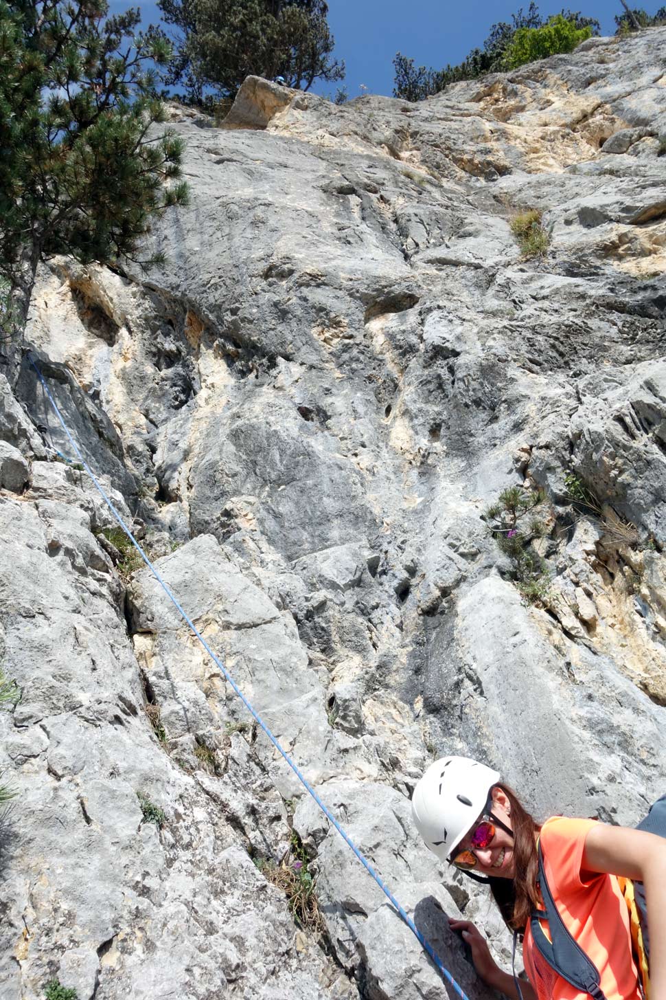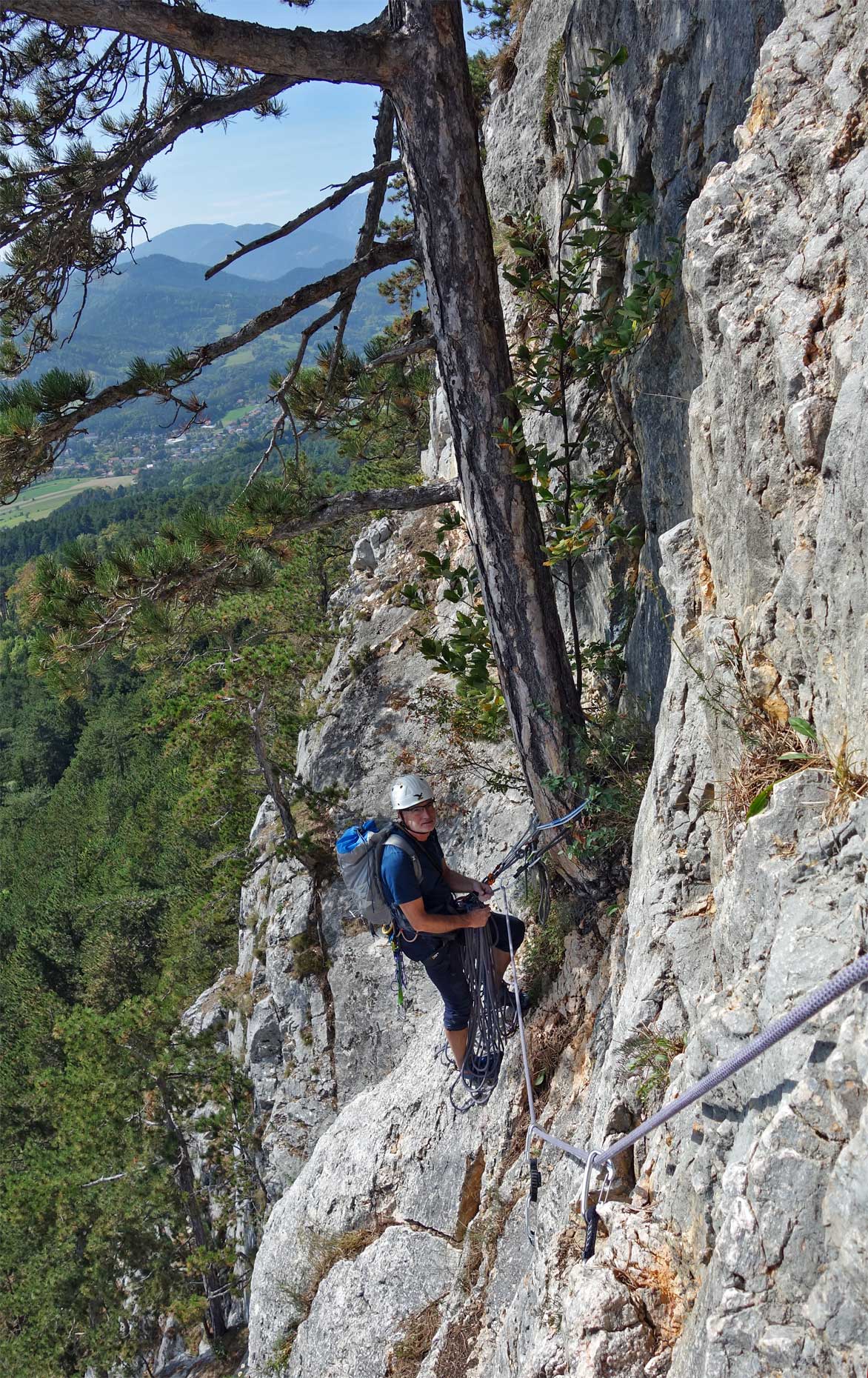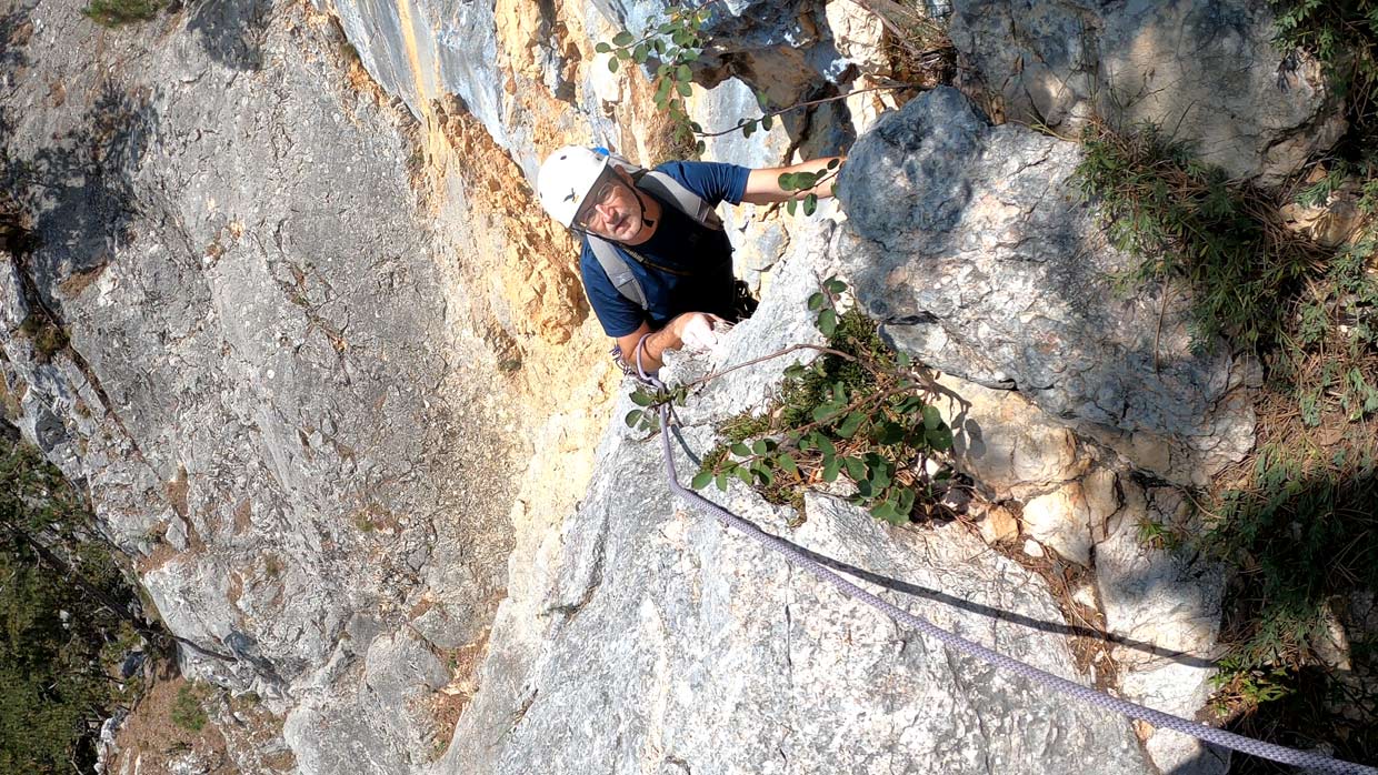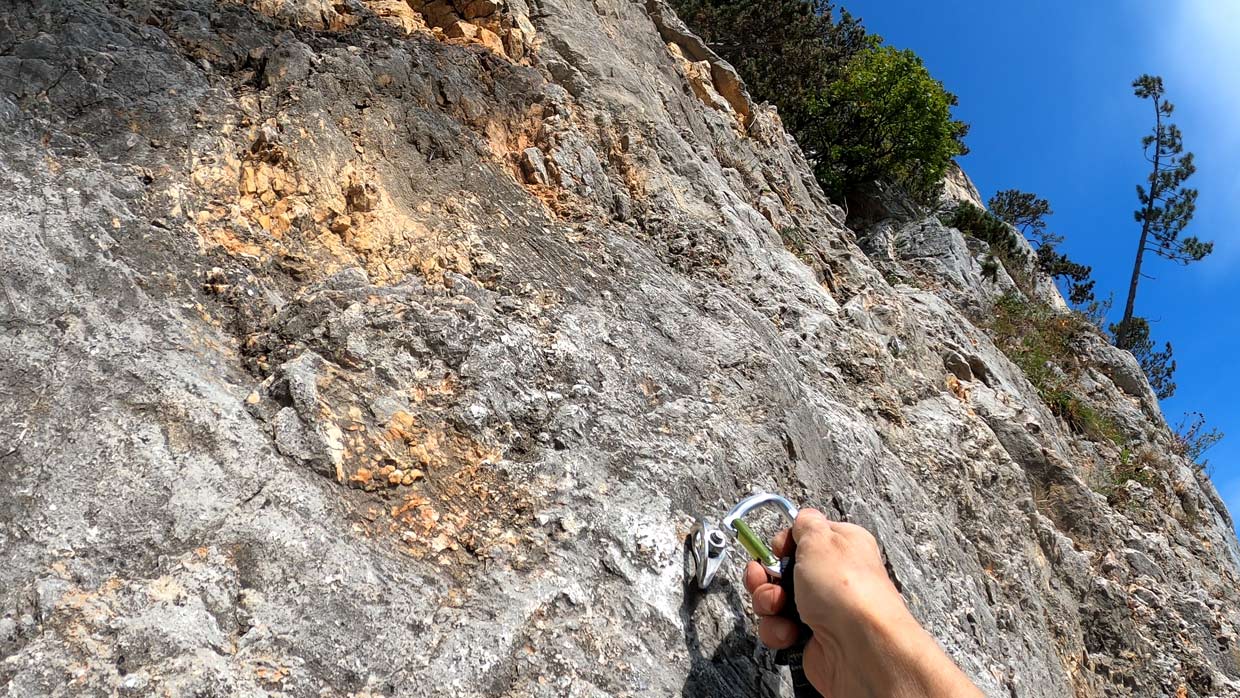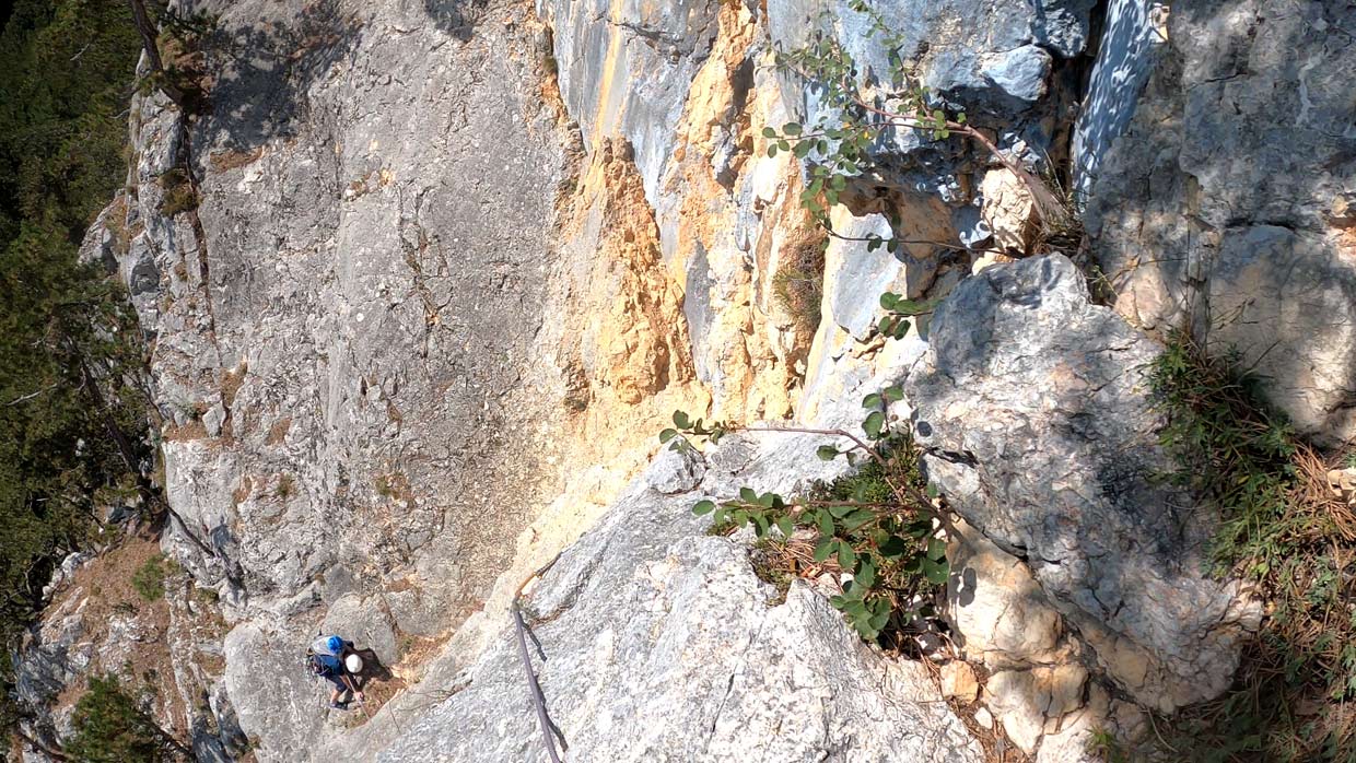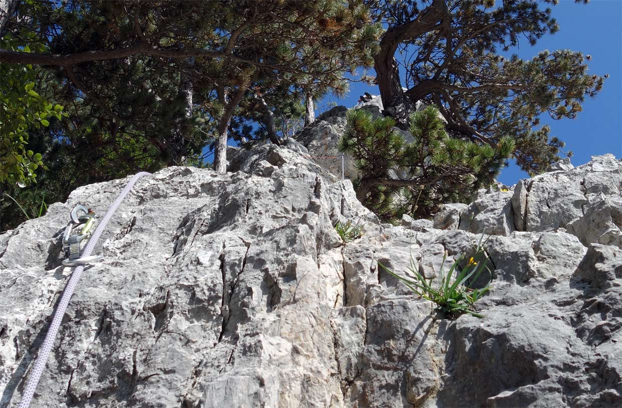 Na prvom štande sme dali prednosť rakúskej dvojici, ktorá vyrazila hneď za nami. "Môj spolulezec lezie osmičky," povedala nám lezkyňa, s ktoru sme zdieľali štand. Vzhľadom na to, že ten chlapec liezol osmičky, bol v tej druhej dĺžke akosi dlho. O chvíľu som zistil prečo. V ceste sa začínalo vážne liezť - znova tam bola technická platnička, síce kratšia ale strmšia ako tá na začiatku. Táto mi sadla, ale spolu so spolulezcom Borisom sme sa zhodli, že by si zaslúžila vyššie ohodnotenie než päťku uvádzanú v tope z Bergsteigen.com. Z platničky sa pokračovalo cez vytláčajúcu hranu s dobrými chytmi až ku štandu na strome. Bol by som pokračoval ďalej, ale už mi chýbali expresky. Zaručene som ich použil viac než 9 uvedených v tope.