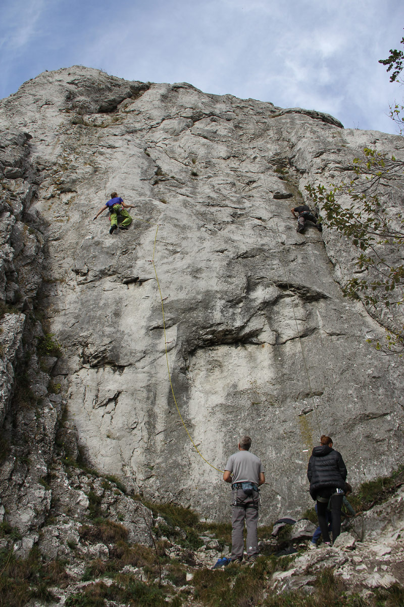 Po mne, s horným istením, nasledovala Natália. Síce finálne vytláčajúce balvany dala, ale s tou chybičkou, že sa v lezeckom vypätí nevypla z borháku. Takže síce liezla nahor, ale namiesto toho, aby som lano doberal, som ho musel uvoľňovať. Ležala potom na bruchu na balvanoch, nohy vo vzduchu a lano v nevypnutom borháku ju ťahalo dole. Chvíľku sa márne usilovala vypnúť lano, ale napokon si pomohla štandartným spôsobom, že lano chytila do zubov, aby jej neutekalo. Potom sa jej podarilo uvoľniť ho z expresky.