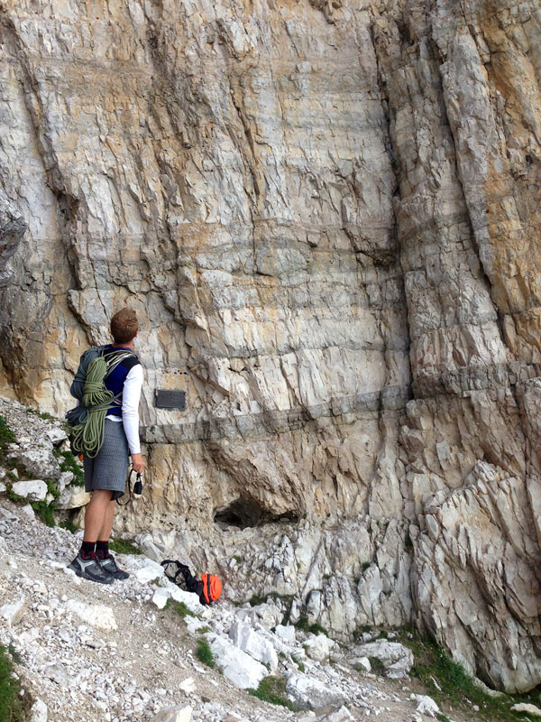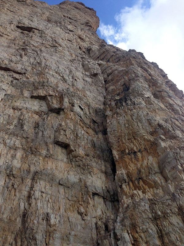 Juraj: Vidím že si výborne informovaný. Spigolo Giallo sme s Katkou liezli v júli 2014. Keď sme prišli na nástup, bolo prázdno, možno aj preto, že sme celý týždeň liezli v Dolomitoch v nie práve rozprávkovom počasí a boli sme ochotní naliezť do ciest, aj keď predpoveď počasia nebola ideálna. Napriek tomu sa za nás už na nástupe zaradila nemecká dvojka. Tí však našu rozvahu, rozumej pomalosť :), v 6 dĺžke nezvládli a zlanili späť do doliny. Boli sme celkom radi, pretože Katku toto družstvo dosť znervózňovalo a tým pádom mňa tiež. Keď sme v ceste osameli, cítili sme sa lepšie a oveľa lepšie sa nám aj liezlo.