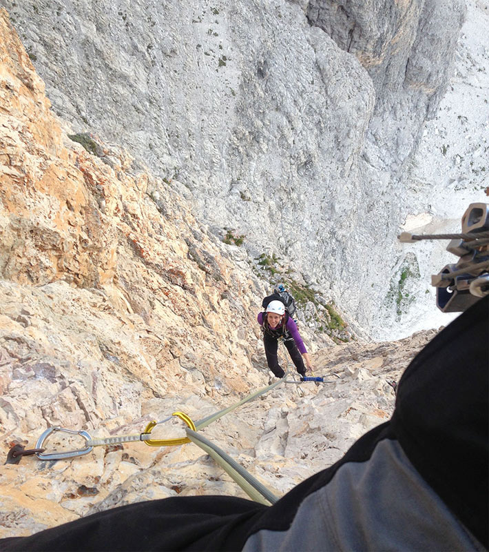 Katka: Jurovi trvalo asi dva dni, kým ma na túto cestu prehovoril. Mali sme za sebou vylezené dve dolomitské cesty (Normálku na Cima Piccola a Primo Spigolo na Tofana di Rozes). Najprv som bola prekvapená, že si túto cestu trúfol so mnou liezť, keďže v horách to bola moja prvá skúsenosť. Akosi prirodzene som mu dôverovala, že vie čo robí a robí to dobre. Od začiatku po koniec to bol úžasný zážitok, so všetkým, čo k tomu patrí. Ak si odmyslím pre mňa pár nepríjemných úsekov v traverze, celú cestu som si užívala nádherné lezenie s krásnymi dolomitskými výhľadmi. Určite bude na čo dlho spomínať, či už na skvelý západ slnka, alebo morálový zostup do sedla medzi Anticimou a Cimou Piccola cez uzučkú poličku bez istenia. Pri tejto spomienke mi ešte stále nabiehajú zimomriavky...
