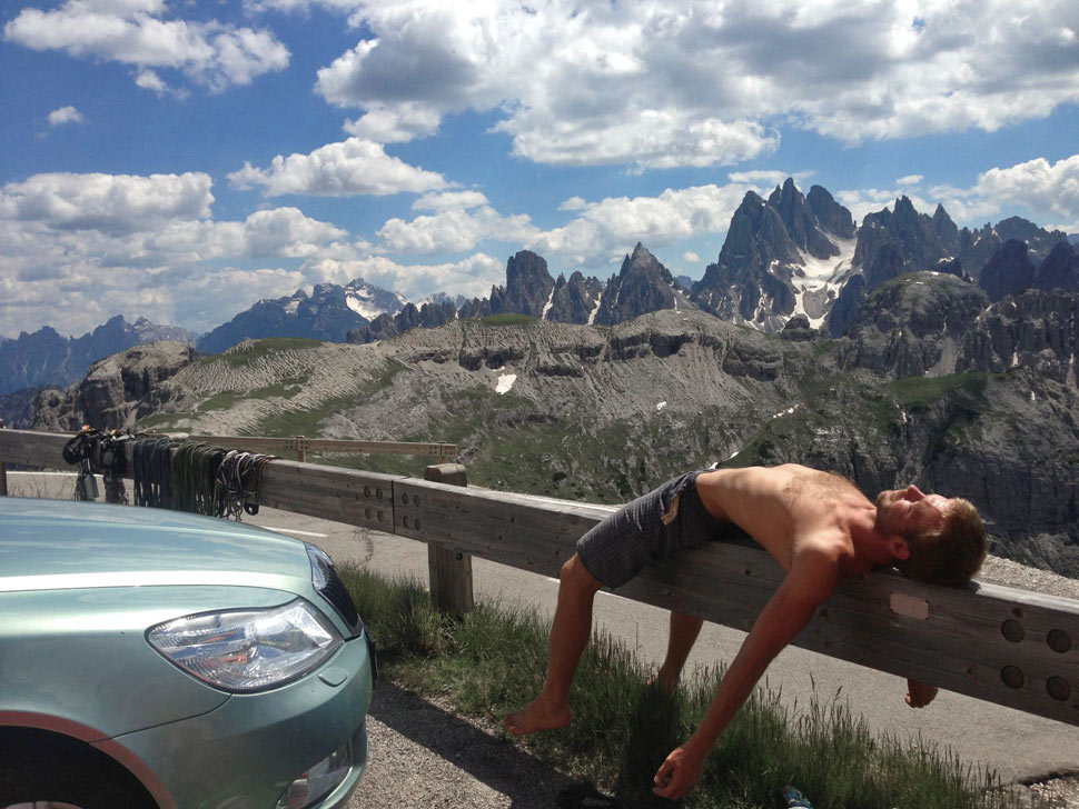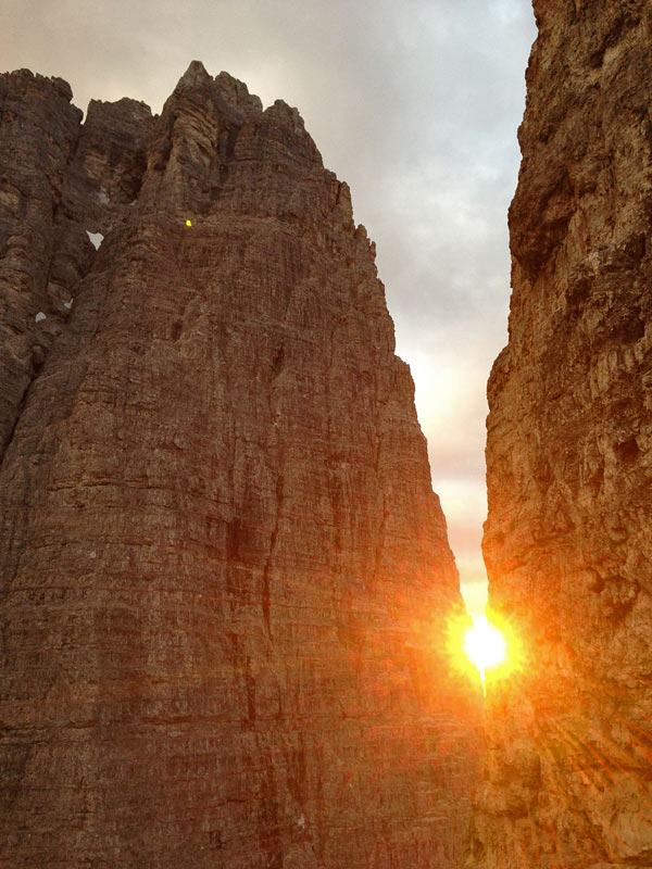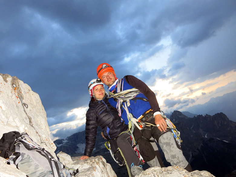 Katka: Výstup nám trval asi desať hodín. Najviac času sme kvôli nie najlepšej orientácii venovali najľahším dĺžkam, čo sme spočiatku nepredpokladali. Očakávali sme, že práve v nich naženieme trochu času. Bolo to nádherné celodenné lezenie, zavŕšené ideálnym načasovaním výstupu na vrchol presne na čarovný západ slnka. Pre mňa bol tento moment jedným z najsilnejších prírodných zážitkov - slnko zapadalo presne do priestoru medzi Cima Grande a Cima Piccola, vytváralo neskutočné svetelné efekty...