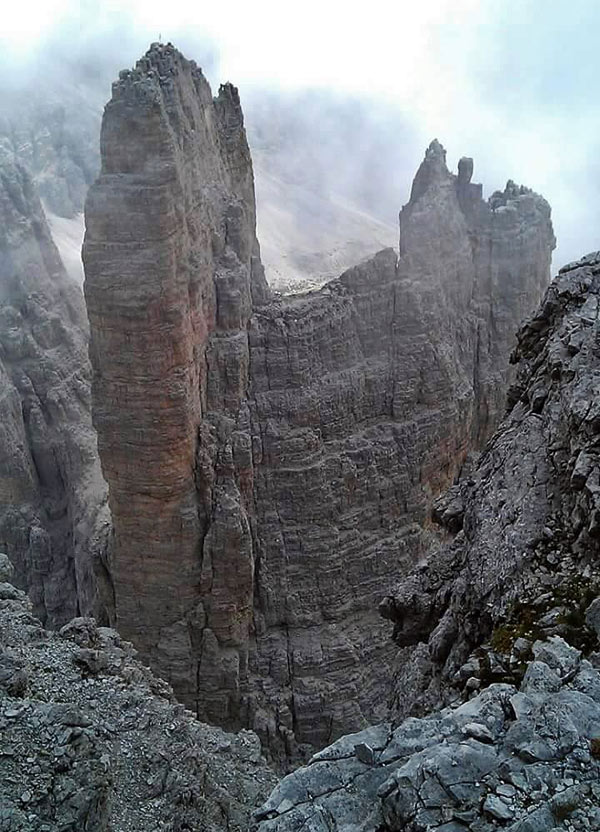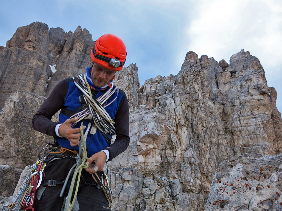 Juraj: Pred touto cestou sme si dali Normálku na Cima Piccola, takže sme časť zostupu už poznali. Cesta Spigolo Giallo vedie na predvrchol - Anticima della Cima Piccola. To znamená po dolezení traverznúť na hlavnú Cimu. Bol to veľmi exponovaný traverz, aby sme boli rýchlejší, išli sme ho bez istenia. Pri traverze nám "pomáhal" aj letný dáždik, ktorý sa na nás spustil už pri lezení poslednej dĺžky. Bolo celkom inšpirujúce hľadať zlaňáky na veži potme, v hmle a daždi. Ak by sme tadiaľ pár dní predtým už raz nezlaňovali, od strachu by som asi pustil do gatí. Zlaňáky sú však urobené logicky a je potrebné urobiť okolo trinásť zlanení do žľabu medzi Cima Grande a Cima Piccola.