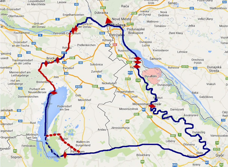 Bratislava – Dunaj – Mošonský Dunaj – Rábca – Hansági focsatorna – Neusiedler See – Leitha – Dunaj – Bratislava.