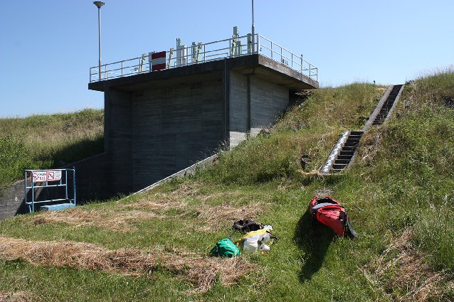 Hoci som len 20 km od centra Bratislavy, cítim sa zrazu ako v úplnej divočine. Rieka je tu veľmi pekná, pôžitok pádlovať. Bohužiaľ po asi 1,5 km ďalšia prenáška. Pristávam v predstihu na pravom brehu, pretože prúd sa zrýchľuje a ťahá do hrozivého tunela stavidla. Ťahať pomocou lana plný kajak strmým brehom z vody je pre jedného človeka nemožné a tak musím kajak aspoň čiastočne odľahčiť. Asi 150 m na kolieskach v divokom teréne a už je tu vysoká a strmá hrádza. Síce so schodmi, ale po oboch stranách ostré lomové kamene. Kajak musím kompletne vyložiť, prázdny má 27 kg a vytiahnuť na hrádzu. Potom povynášať batožinu (asi 30 kg) a znovu naložiť. To všetko v páliacom slnku a s útočiacimi komármi.