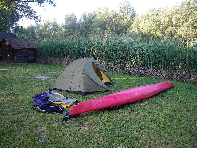 Ďalej svižný prúd. Zastavujem okolo 12. hod na dlhšiu pauzu pri rybárskej chatke: je v lese, množstvo komárov, musím si obliecť dlhé nohavice, podkolienky, flisovú mikinu, aj keď je strašne horúco. Na tvár a ruky ešte repelent. Chrbát potrebuje oddych a naťahujem sa na lavicu. Dám si v Dunaji ulovenú plechovku energetického nápoja, ktorý ale účinkuje tak, že zaspím! Zobudím sa na hlasy: po prúde krásne šuštia kanoe a Maďari, ktorých som ráno stretol v kempe ma zdravia. Bol som tu skoro 2 hodiny a stálo to za to. S chuťou pádlujem ďalej a postupne zas všetkých dobieham.