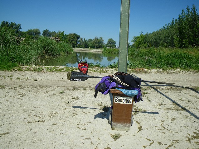 Hľadám rozumnú možnosť na prenášku: rozhodujem sa pre pravý breh. Kajak naväzujem na kolieska, prekrižujem hrádzu a lesnou cestou sa snažím priblížiť k Mošonskému Dunaju. Začínajú útoky komárov, ktoré ma odteraz budú sprevádzať celých 6 dní. Asi po 300 m narazím v tejto džungli na maringotku nejakého rybára, kde je prijateľný prístup k vode. Navyše aj stôl a lavička a tak komfortne obedujem a ďakujem v duchu neznámemu rybárovi.
