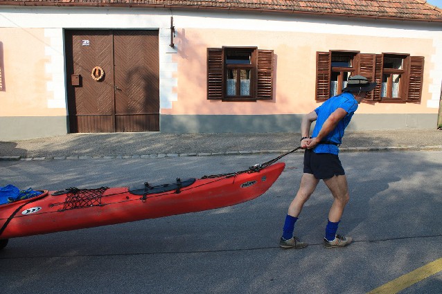 Cesta späť sa ukazovala možná po riečke Leitha s dvomi veľkými prenáškami: 14 a 8 km, čo by pri dobrých kolieskach nemuselo byť až tak veľa. Po testovacom ťahaní na ceste k Botanickej záhrade s mojimi malými kolieskami som si uvedomil, že treba ešte koncové koliesko, ktoré zabráni šúchaniu konca dlhého morského kajaku o zem a pokiaľ možno i väčšie hlavné kolieska s ložiskami. Zasvätil som do nápadu kamaráta z nášho klubu Joža Benčúrika, ktorý mi šikovne a rýchlo koncové koliesko vyrobil a pomohol s puzdrom do otvoreného ložiska na väčších kolieskach.