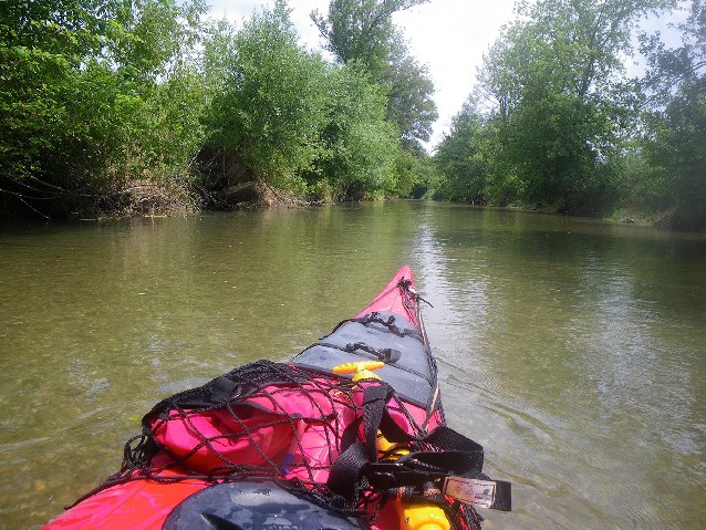 Napriek tomu to beriem celkom pozitívne. Nápisy na stavidle sú v maďarčine: Régi Rajkai zsilip a tak už viem, že som už prekročil hranicu. Našťastie na druhú stranu ide z hrádze pohodlná prašná cesta, takže kajak naväzujem na kolieska, nakladám a ťahám asi 150 m ešte aj cez most na priesakovom kanáli (Homokparti zsilip), ktorý sa tu spája s Mošonským Dunajom a nakladám pomerne pohodlne na vodu na pravom brehu. Táto 2. prenáška mi zabrala asi 1,5 hod. Chrbát dostal zabrať a kríže začínajú bolieť – aj pri pádlovaní. Napriek tomu si jazdu vychutnávam – kajak sa krásne kĺže po prúde.