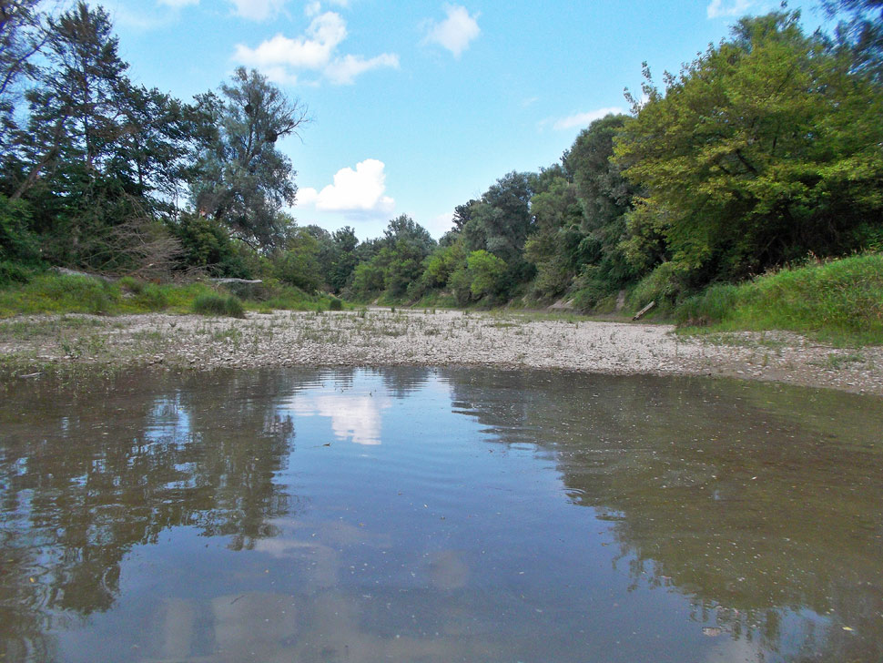 Kedže sme mali dojem, že plavba k miestu, kde budeme prenášať kánojku do ramien, ubehne veľmi rýchlo, tak sme odbočili do jedného ramena, ktoré zrejme patrí tiež k Spittelauerskému ramenu. Nakukli sme doň a zistili sme, že hladina natoľko klesla, že po stovke metrov z vody vytŕča štrkové dno.
