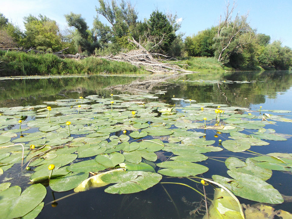 V následnom Stopfenreuthskom ramene sme sa plavili bez prenášania, aj keď sme si trasu museli pozorne vyberať, pretože voda nebola hlboká. Žlté leknové kvety akoby chceli ukázať, o koľko klesla hladina a vytŕčali sa niekoľko centimetrov nad vodu. Z lode sme museli vysadnúť akurát pár metrov pred horným koncom tohto ramena, keď sme sa blížili k finálnym dreveným schodíkom.