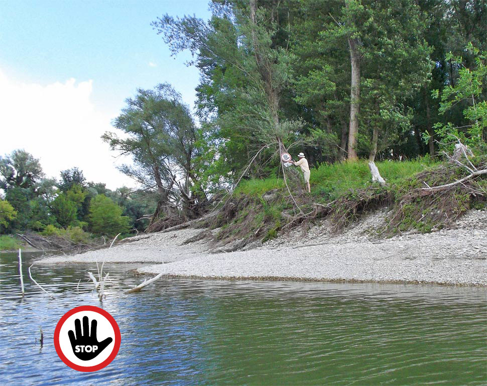 Tak sme si len lebedili na štrkovom výbežku na začiatku ramena. Netrvalo to však dlho. Zakrátko som na Dunaji uvidel motorovú pramicu. Z nej vystúpil chlapík v klobúku a vysvitlo, že mieri k nám - išlo o rangera z Národného parku Donauauen, čiže z prírodnej rezervácie Dunajské luhy. Slušne nás pozdravil a upozornil, že sme vošli do "citlivej oblasti", ktorá je z dôvodov ochrany prírody chránená a nemá sa do nej vstupovať. Zároveň nám dal mapu, na ktorej to bolo vyznačené. Zdržiavať sa možno len na štrkových a piesočnatých plážach priamo na brehu Dunaja, a aj to len na niektorých. Plavba dvoma ramenami, ktorými sa plánujeme vrátiť nazad, je ale povolená. Ranger zároveň začal na pribíjať na strom spadnutú značku, ktorá upozorňuje, že do tejto časti Spittelauerského ramena je vstup zakázaný.