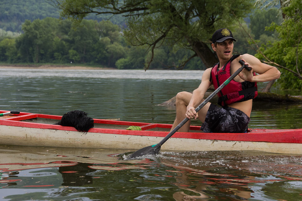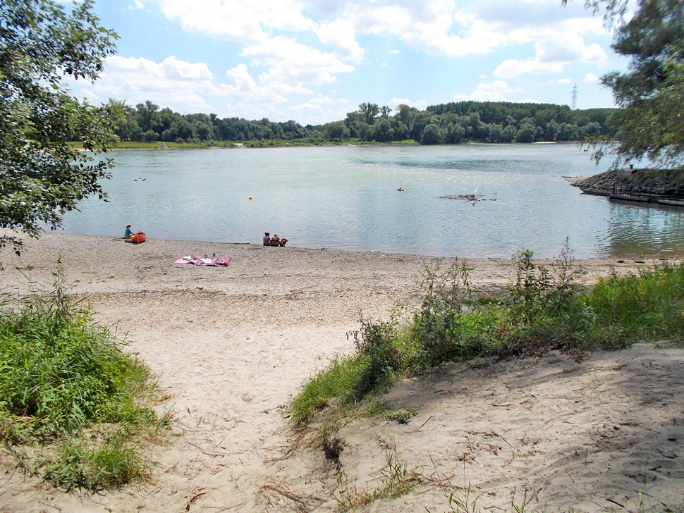 Štartovali sme pri Au-Terasse, čiže Lužnej terase pri Dunaji neďaleko Stopfenreuthu. Spustili sme sa dolu Dunajom. Na štrkových plážach sa opaľovali ľudia. Na mieste, kde vteká do Dunaja Stopfenreuthské rameno, sme mali šťastie - sledovali sme rybára, ako vyťahuje z vody sumca. Potom ho dal do náručia synovi, aby pustil rybu nazad do Dunaja.