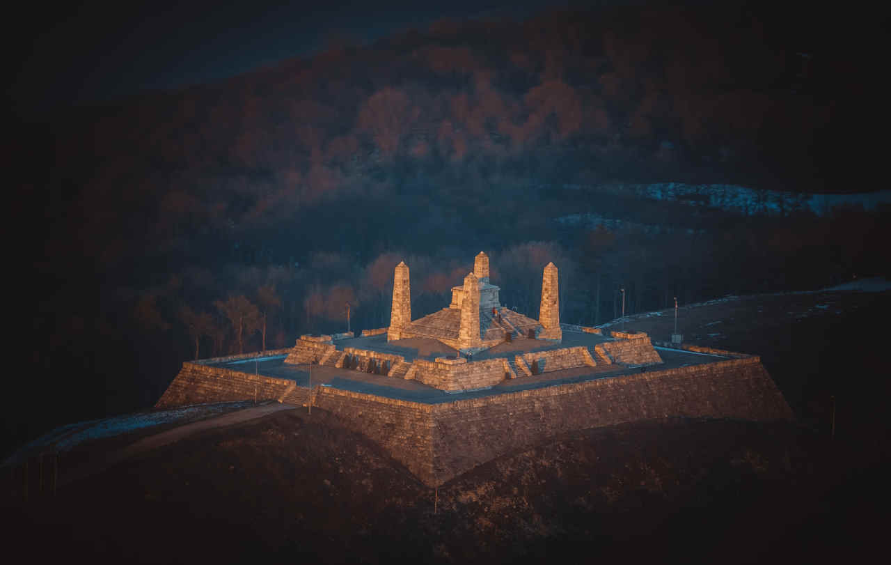 Two aerial photographs from the Milan Rastislav Štefánik Mohyla Mound in Bradlo. In the first picture, the mound at sunset.
