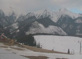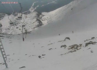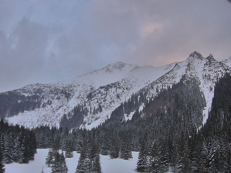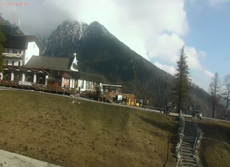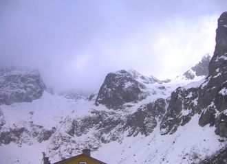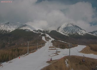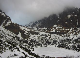 View of Lomnicky Stit Peak and Kezmarsky Stit Peak, Skalanate Pleso Tarn, and observatory building from Skalnate Pleso.