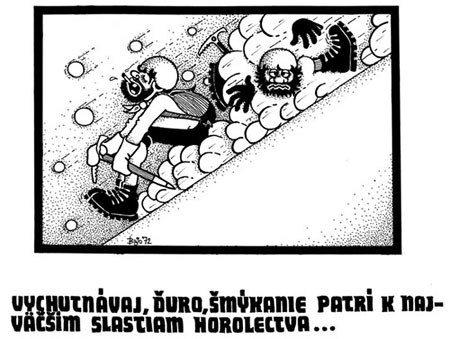 Pravda, to je len jedna z podôb snehu - tá prívetivejšia, krajšia. Sneh má však aj inú tvár - prináša starosti, problémy, kalamity, nehody, nešťastia. Záľahy snehu brzdia i zastavujú dopravu, boria dengľavé strechy a v horách sa spúšťajú nadol v podobe lavín. A práve pri nich, pri lavínach, sa chcem na chvíľu zastaviť. Trikrát som sa v nich ocitol - v tých tatranských - a vždy som sa šťastne vykotúľal - vyplával som - vyviazol. Stačilo, už sa mi lavín viac nežiada... A neraz som pomáhal hľadať a vyslobodzovať z lavín živých i neživých - v pamäti mi utkveli najmä tí živí. Ako ten pod Bradavicou, čo sme ho po polhodine priduseného vytiahli a oživili, a on odrazu vyskočil a začal zbesilo prekutávať lavínisko, vraj, preboha, chlapi, pomôžte, zostala mi tam čapica! A nie a nie ho odtiaľ dostať, až kým mu ktorýsi osvietenec neuštedril šťavnaté zaucho - a už aj poslušne trielil nadol! Šok sa zrejme šokom rozháňa...