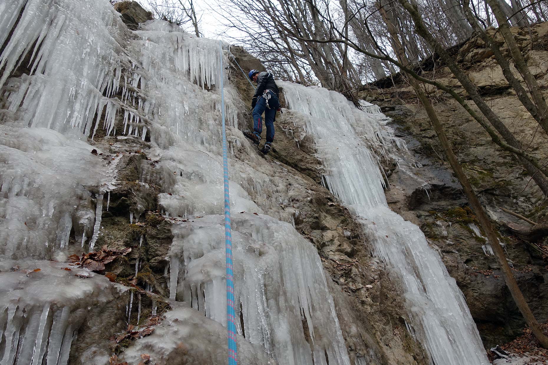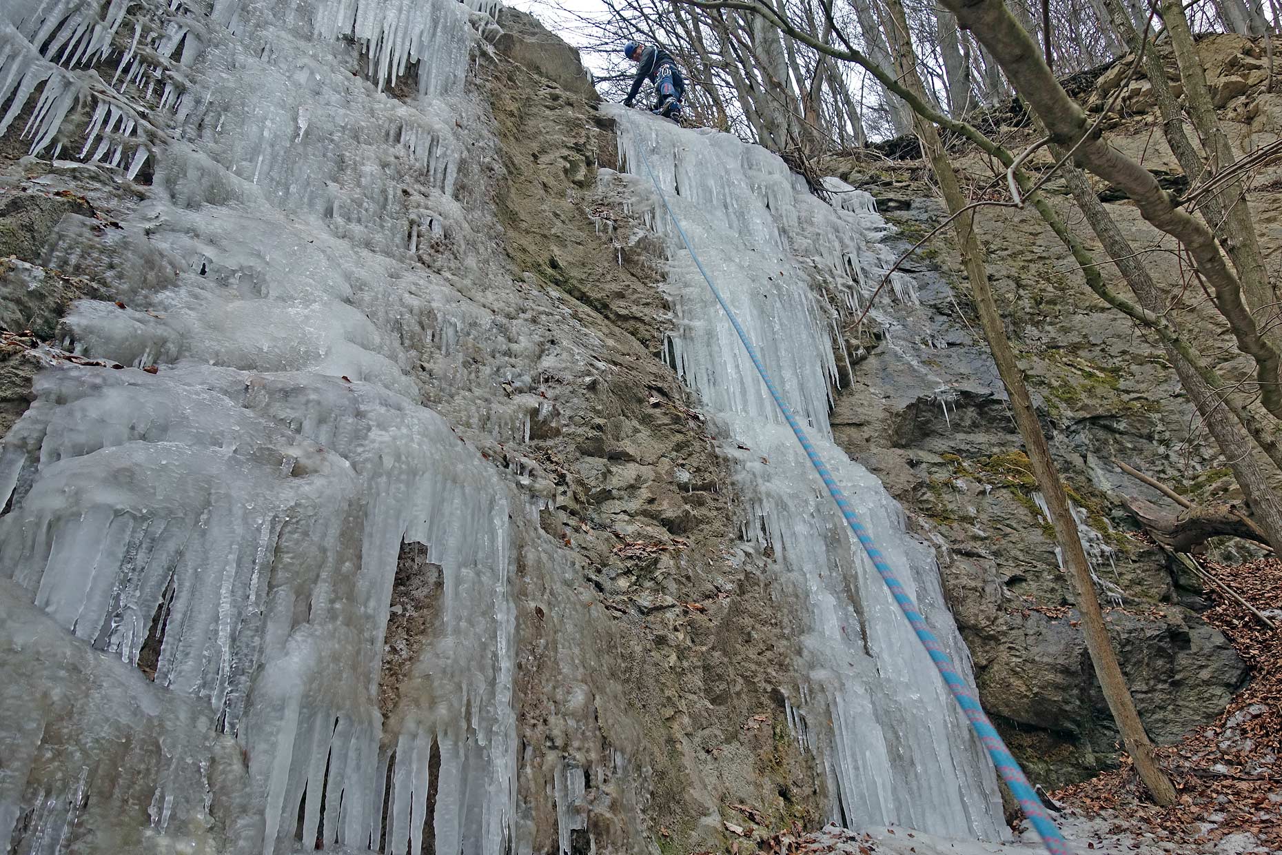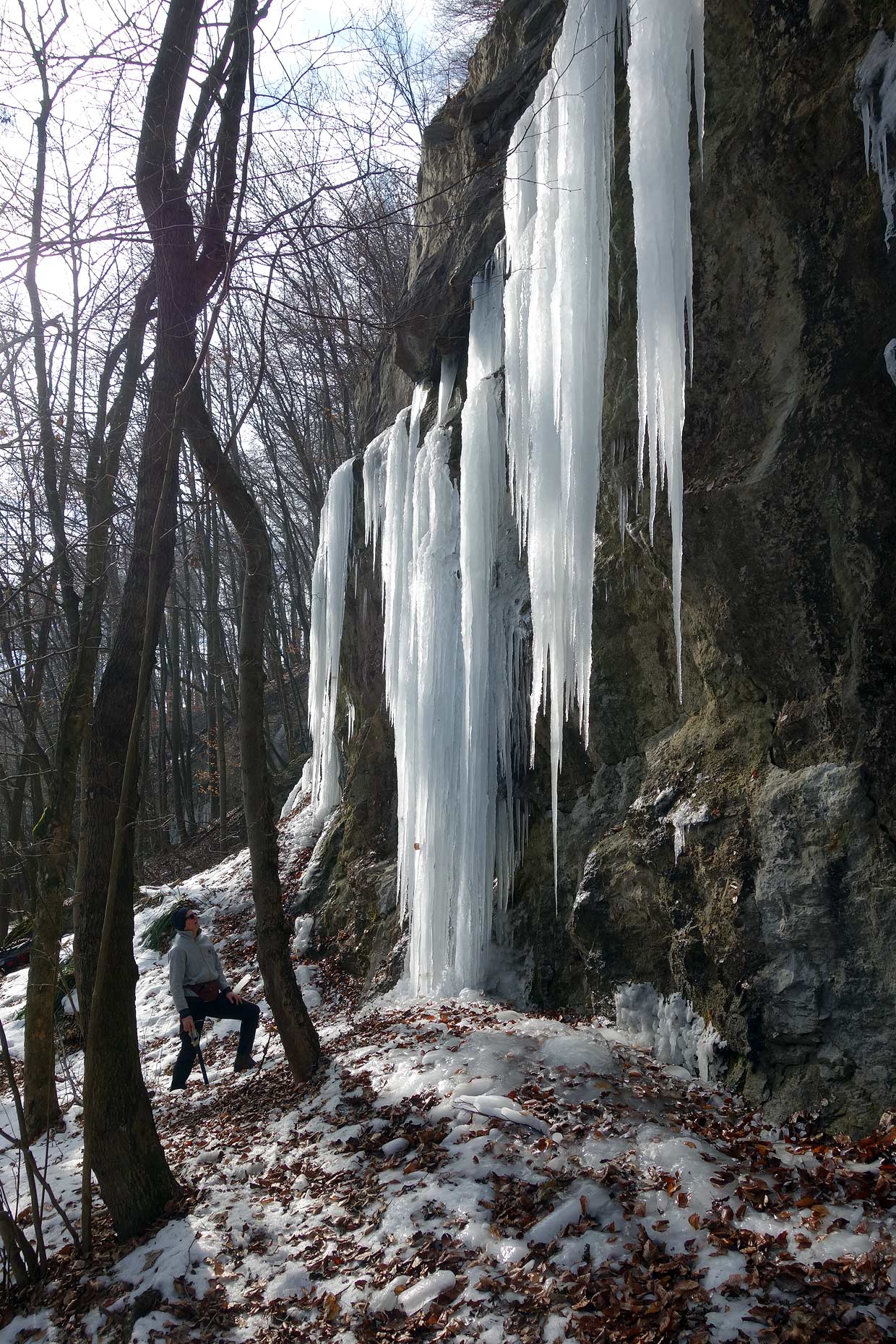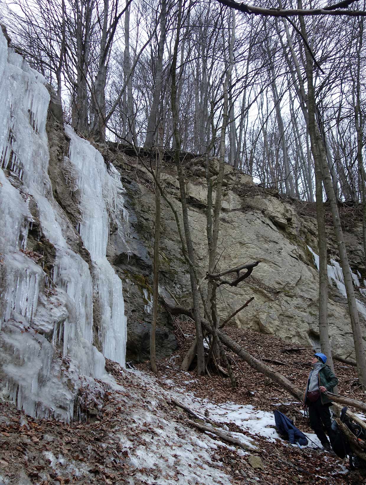 Na ľadíky na snímke vyššie svietilo slnko, boli už veľmi krehké a asi boli aj tak málo natečené a nestačili by na lezenie. Tie na snímkach nižšie boli celkom zachované, pretože na ne menej svietilo slnko. Tam sme si 11. februára 2023 zaliezli.