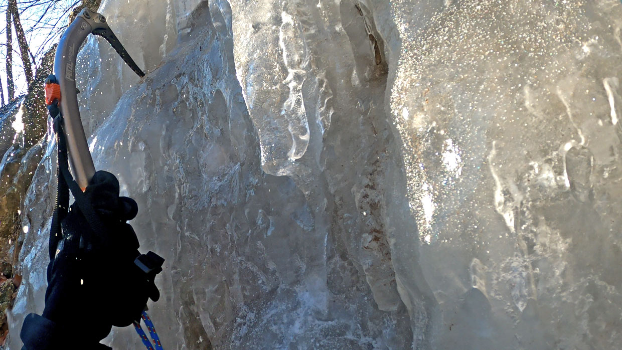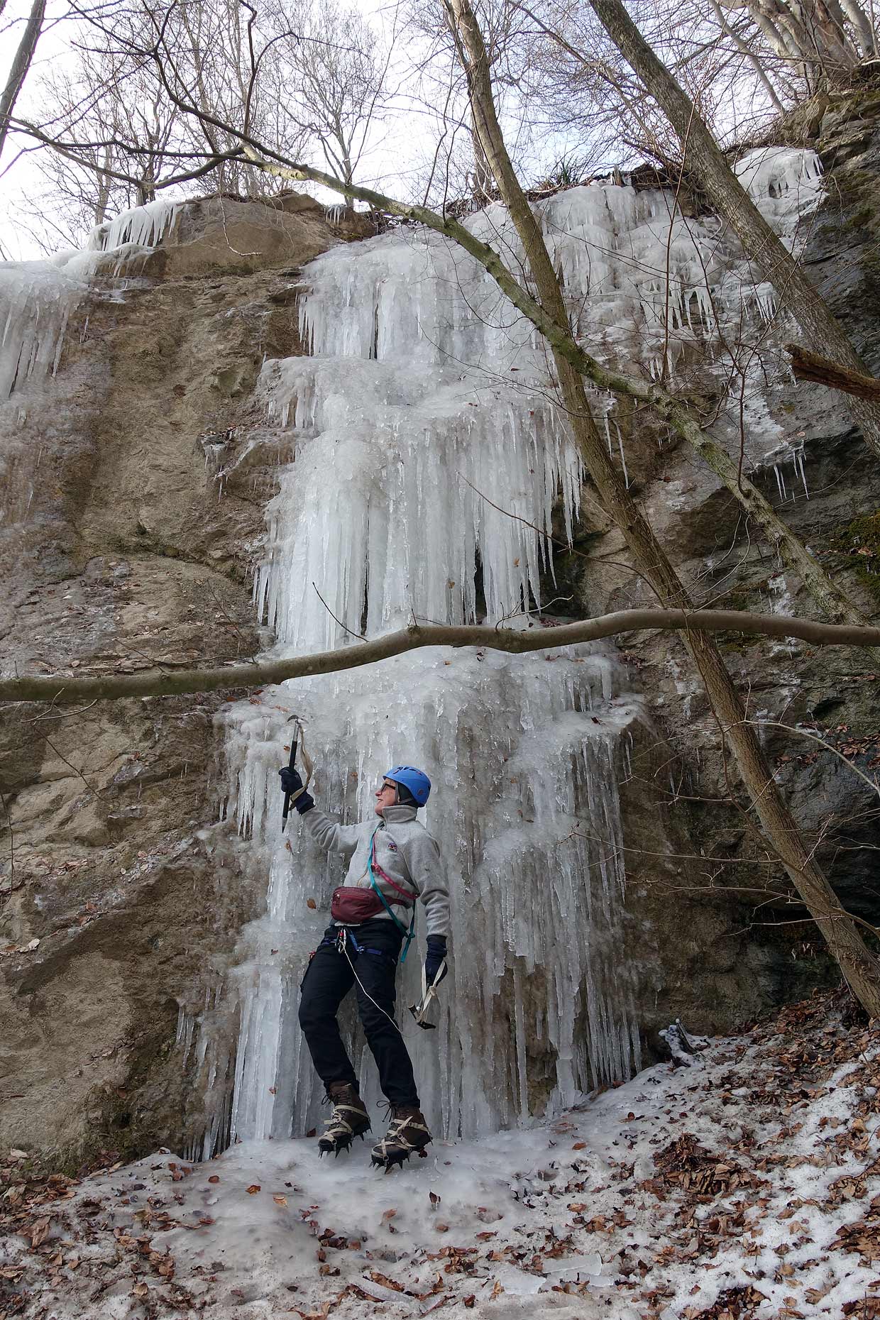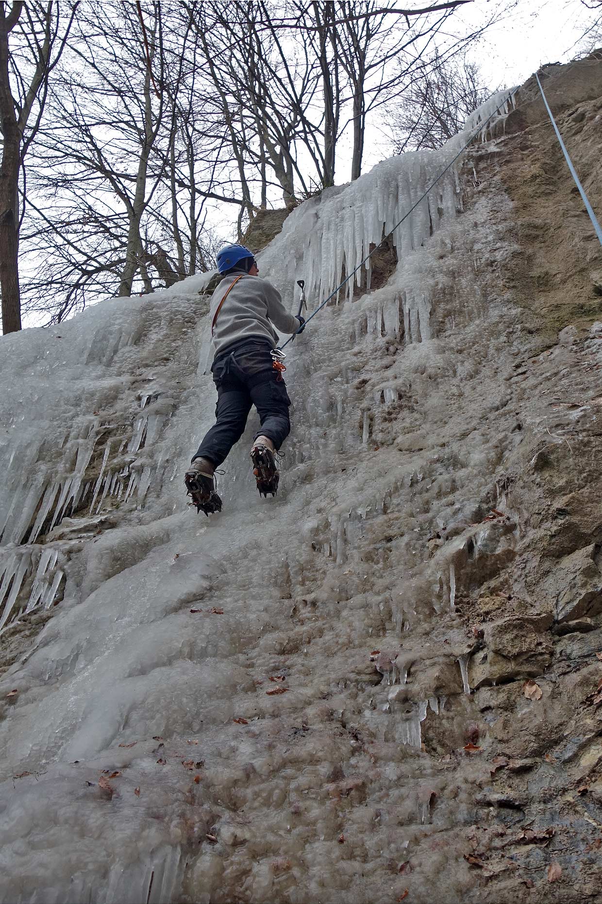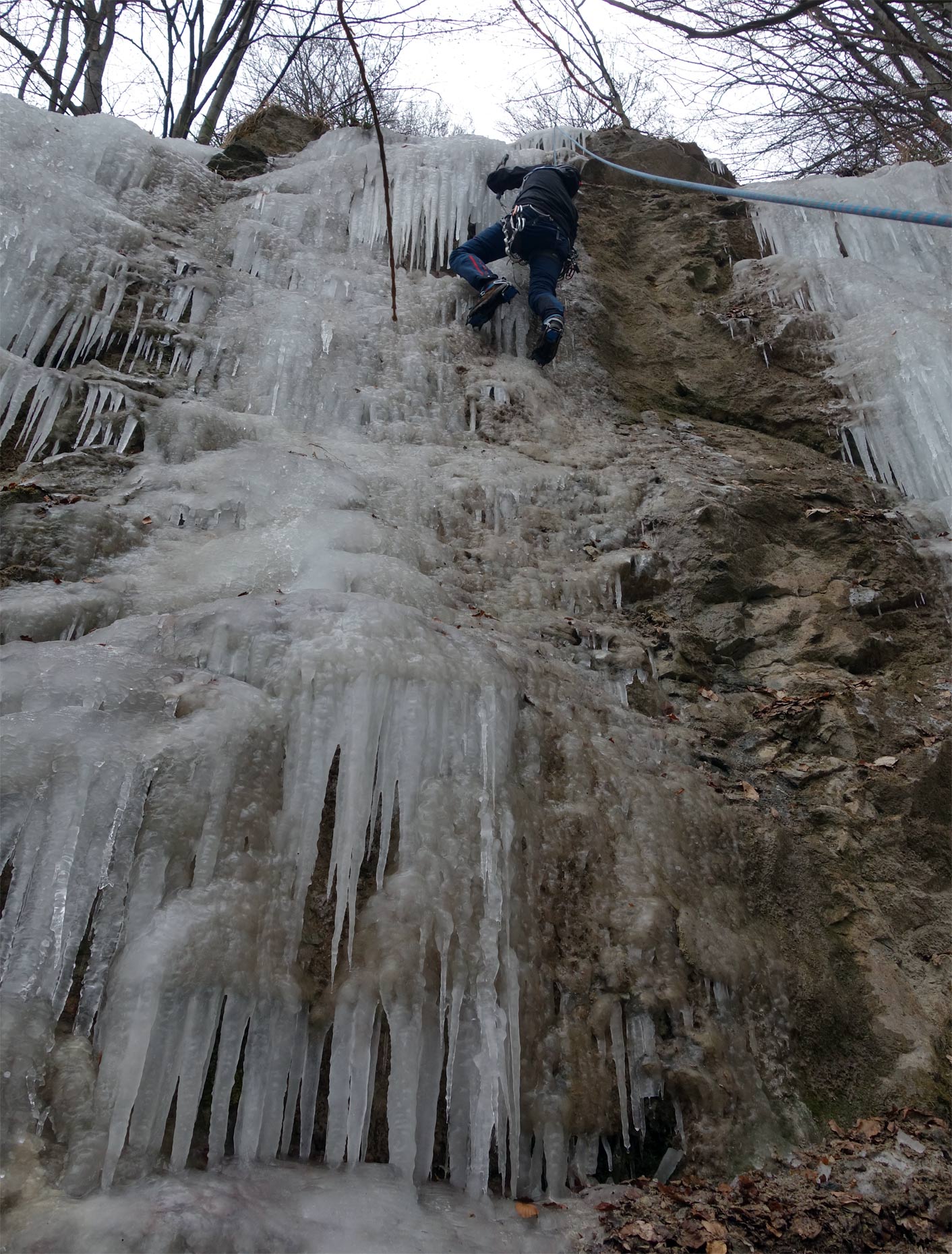 Na ľadíky na snímke vyššie svietilo slnko, boli už veľmi krehké a asi boli aj tak málo natečené a nestačili by na lezenie. Tie na snímkach nižšie boli celkom zachované, pretože na ne menej svietilo slnko. Tam sme si 11. februára 2023 zaliezli.
