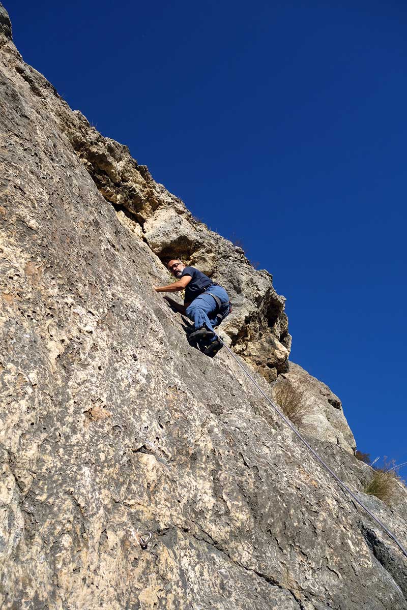 Snímky s lezcom sú z ľahučkej cesty Puklina. V prvej polovici cesty sa v špáre začína kývať jeden kľúčový chyto-stup. V nedeľu bol ešte funkčný a zrejme ešte nejaký čas vydrží. Zvýšte opatrnosť.