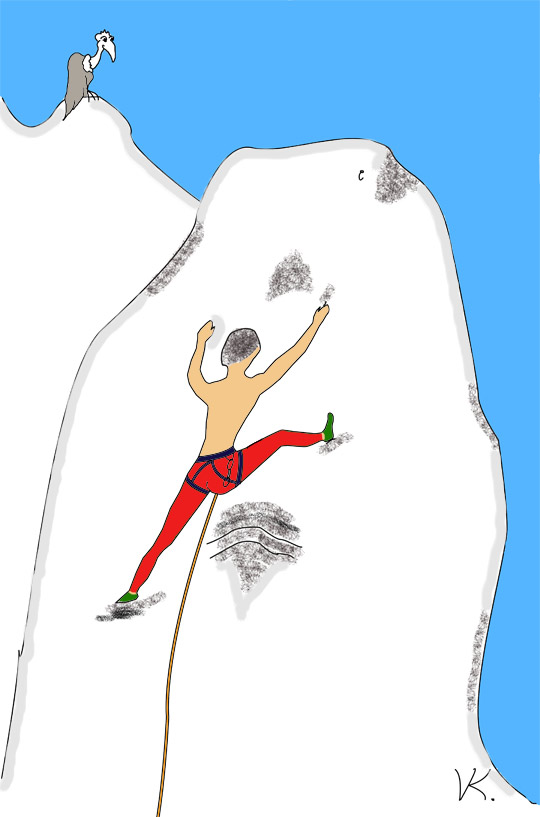 Ivan je naozaj lepší lezec. Pri bouldrovaní v hale prebaletí také špecialitky, cez ktoré sa viem presápať, až keď mi vysvetlí jednotlivé kroky. Ja som na druhej strane silný v niečom, čím sa by som sa veľmi nemal chváliť - vystihuje to starý bonmot "odvaha zlacnela a rozum zdražel". Ivan je vo výške opatrnejší. Preto teraz v kúte váha. Ale myslím si, že som mu dal dobrý softvér. "Dávaj pozor," kričí Ivan. Odpovedám ako vždy: "Stále dávam pozor." (Veď mám poloautomatické istítko...)