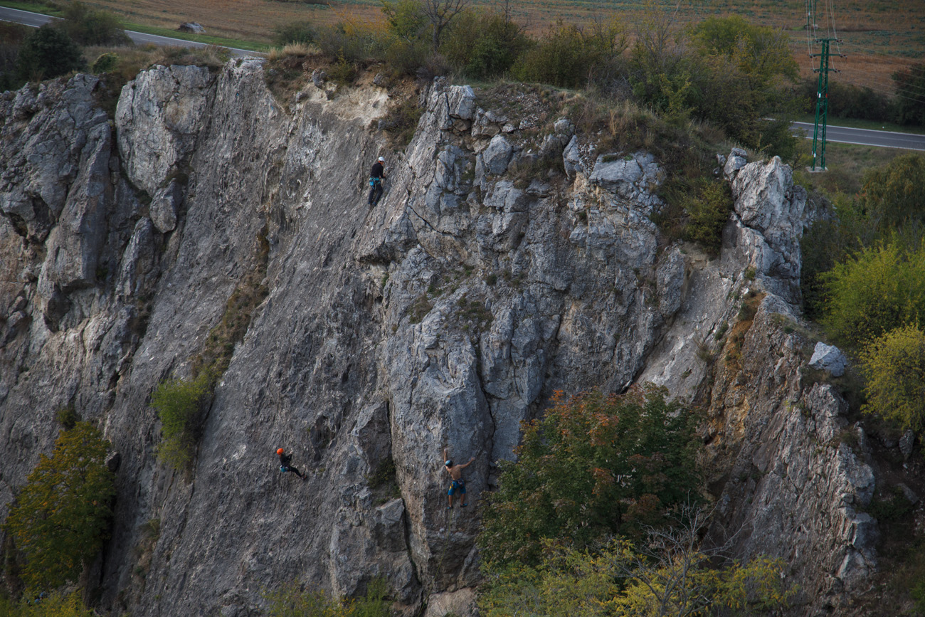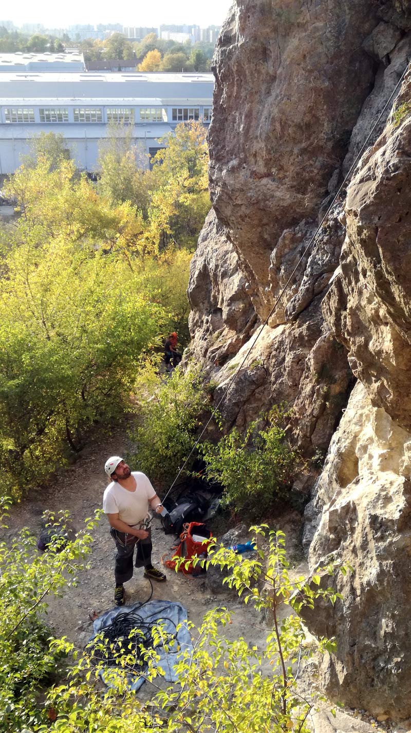 Stredná časť steny na Technickom skle je plná jaskynných útvarov... a aj lepených borhákov. Je vhodná pre kurzy lezenia i pohodové rekreačné lezenie.