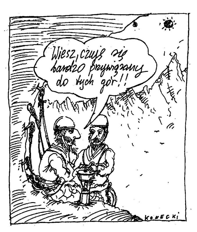 Výraznou osobnosťou poľského horského kresleného humoru je Marek Konecki. Mareka Koneckeho som objavil vďaka stránkam venovaným poľskému himalájizmu. Je to autor, ktorému hory napokon nestačili, pretože v Poľsku je známy aj ako autor aforizmov a básnik.