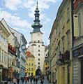 Jediná zachovaná brána stredovekého mestského opevnenia. Jej gotické základy boli položené v 1. polovici 14. storočia. V r. 1511 – 13 bola zvýšená a v r. 1753 – 58 prestavaná do súčasnej podoby, kedy bola na vrchol 51 metrov vysokej veže umiestnená socha sv. Michala. V súčasnosti sa vo veži nachádza Múzeum zbraní a mestského opevnenia. Z veže sa naskytá zaujímavý pohľad na Staré mesto.