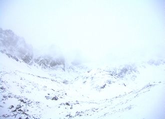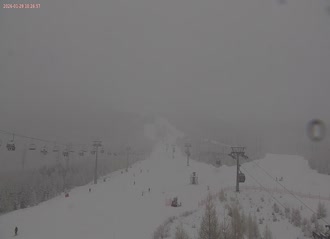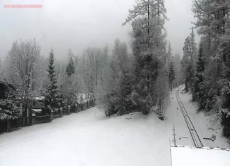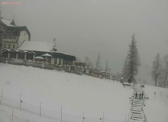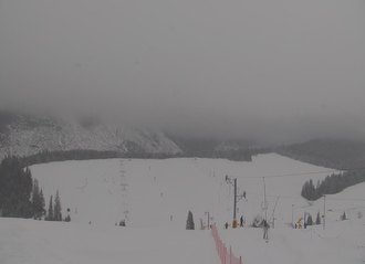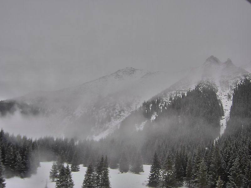 Kamera sníma zo Skalnatého Plesa Lomnický hrebeň a sedlo, Lomnický štít, Vidlový hrebeň, Kežmarský a Huncovský štít, Skalnaté pleso a napokon budovu observatória.
